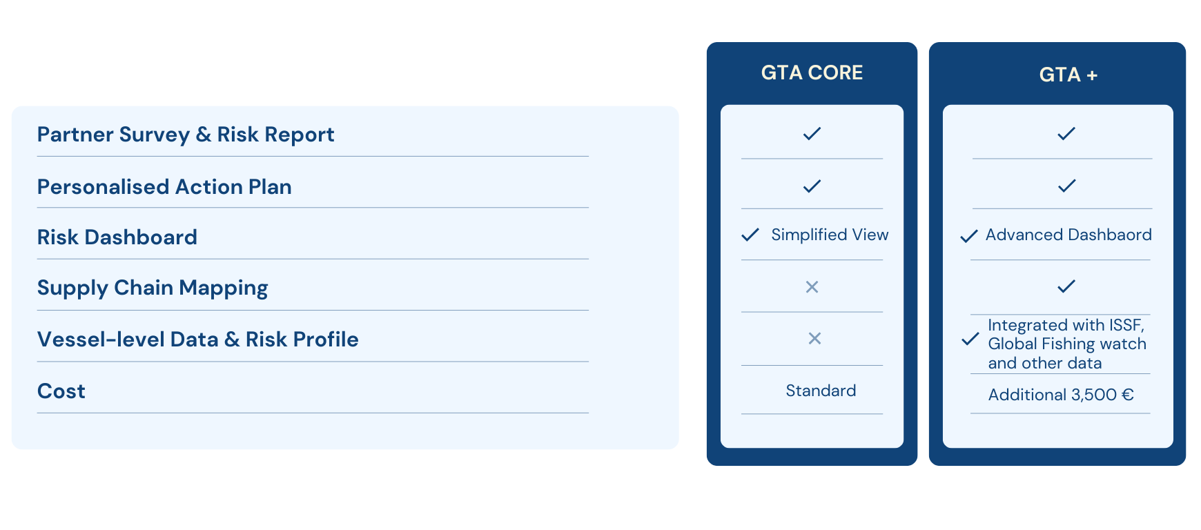 For partners ready to go further, GTA+ builds on Core to show your supply chain all the way down to vessels, connecting your data with trusted external sources such as Global Fishing Watch and ISSF.